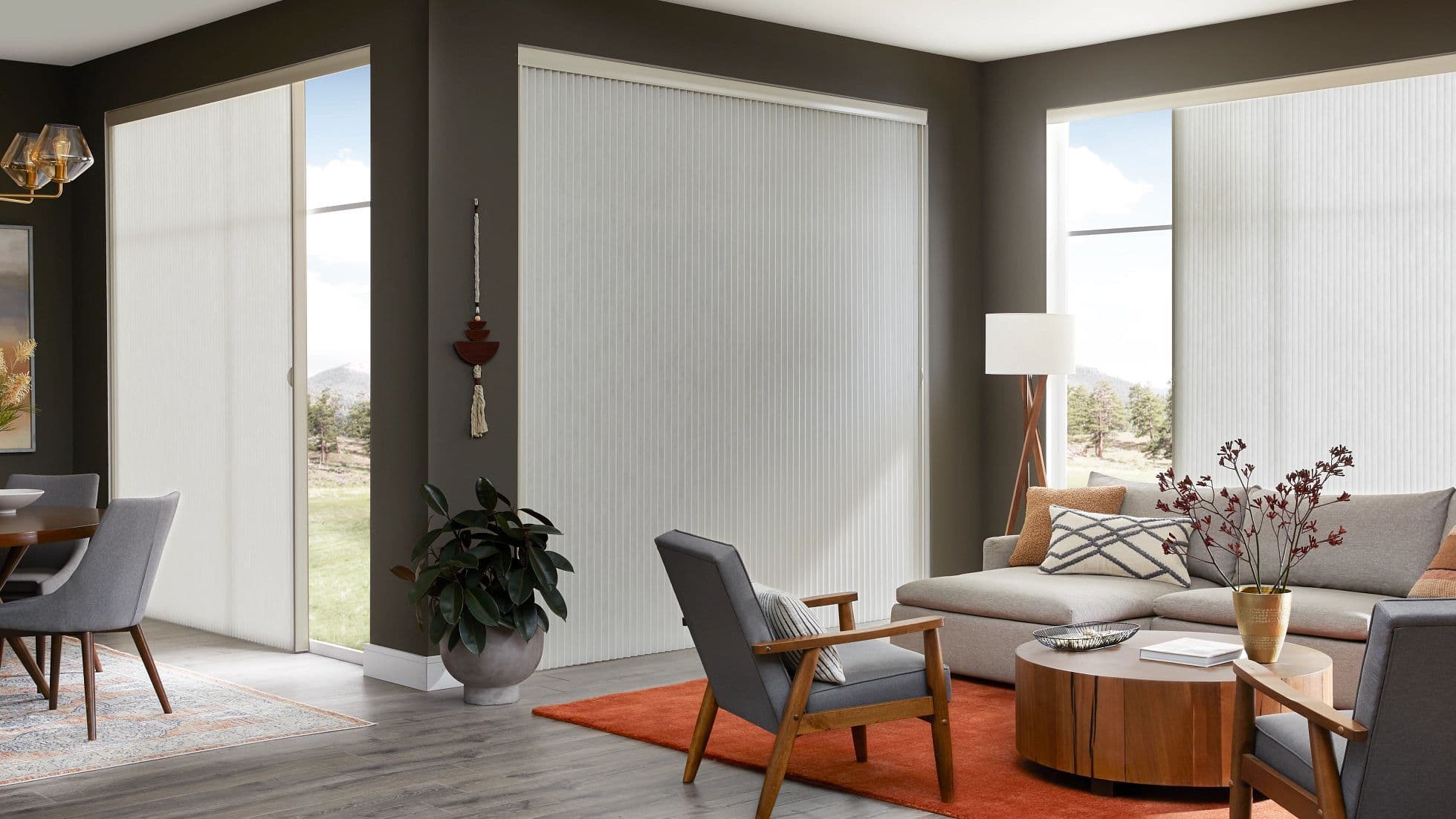 Vertical cellular shades are a great choice for blocking light on sliding doors and for their insulating properties — help keep your energy bills low.