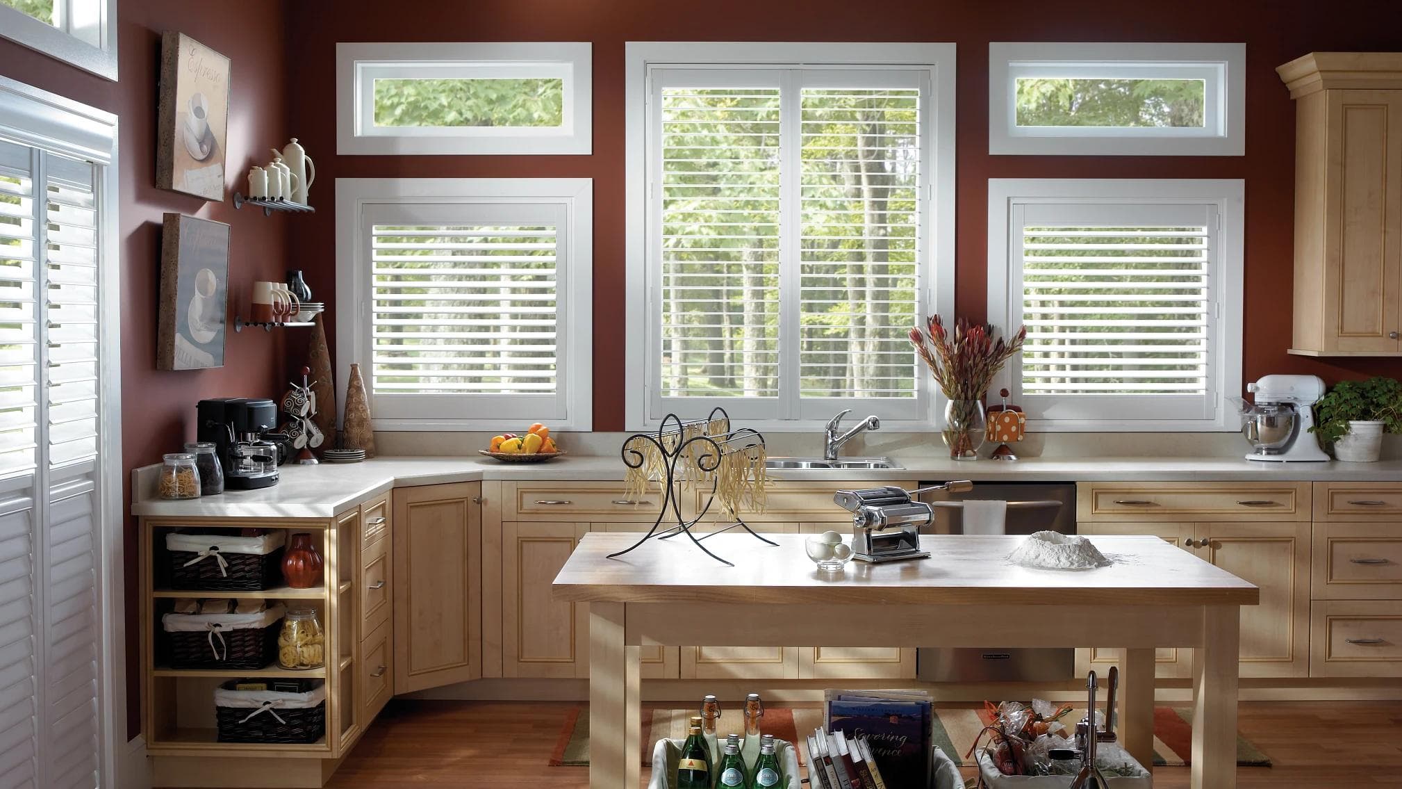 Many of us have windows over the sink or near the stove. Whichever window treatment you decide to add to your kitchen, just keep in mind they will need to be cleaned at some point. The kitchen is full of grease, oils, and odors from the food you cook. Selecting a style that can stand up to these factors is so important. The material you decide to use in your design will make all the difference in creating the perfect kitchen window treatment style. Some of our durable and easy to clean options include faux wood blinds and polyresin custom shutters.