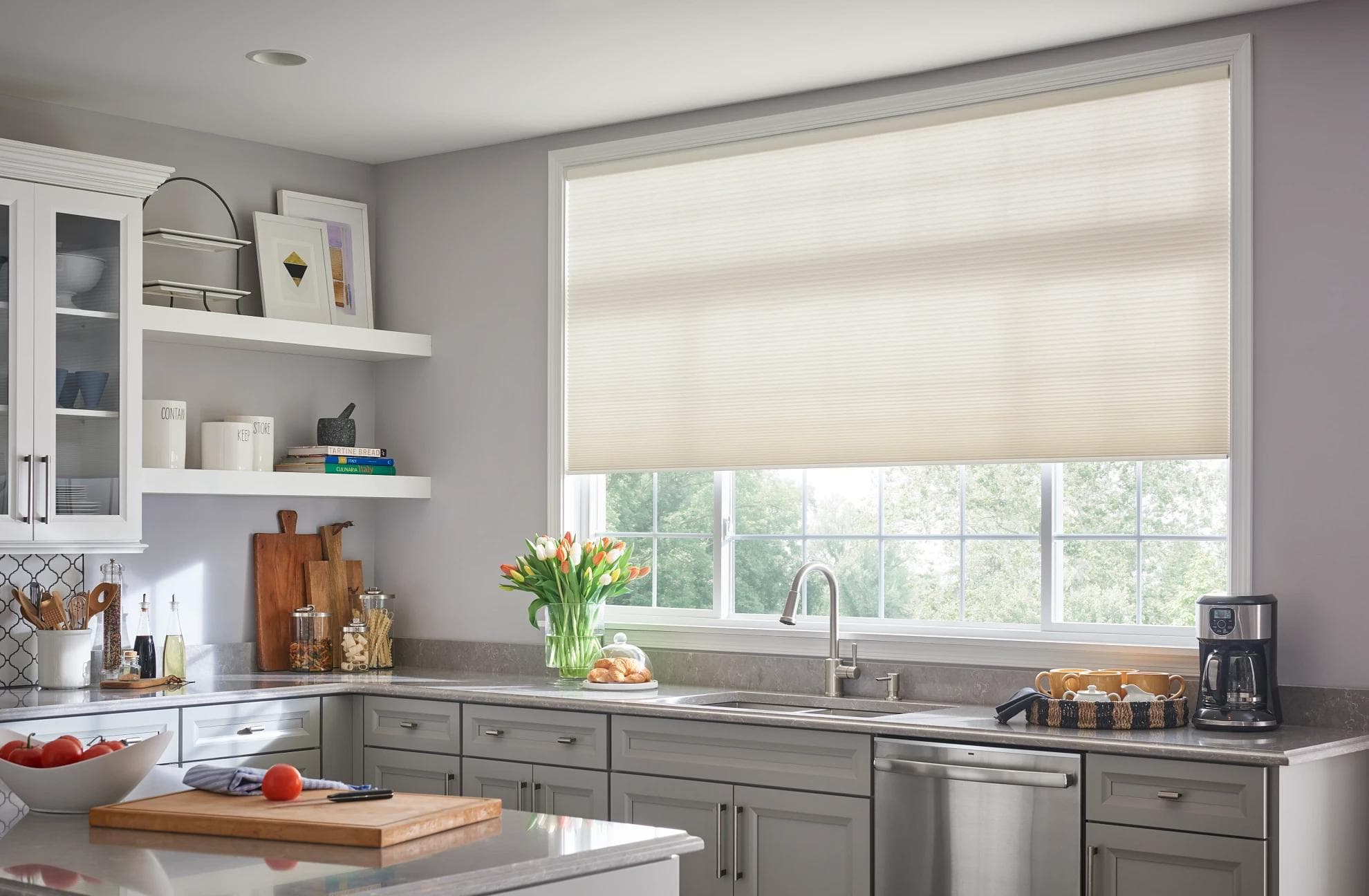 When you start to think about how to choose the right window treatment for the kitchen, you might be dealing with a variety of windows of different shapes and sizes. Keep in mind the location of the windows within your kitchen. If they are over the sink, you may want more visibility to the outside. If your windows are near where you eat and are in direct sunlight, you may want to block out some of the heat from the sun in an already hot room.